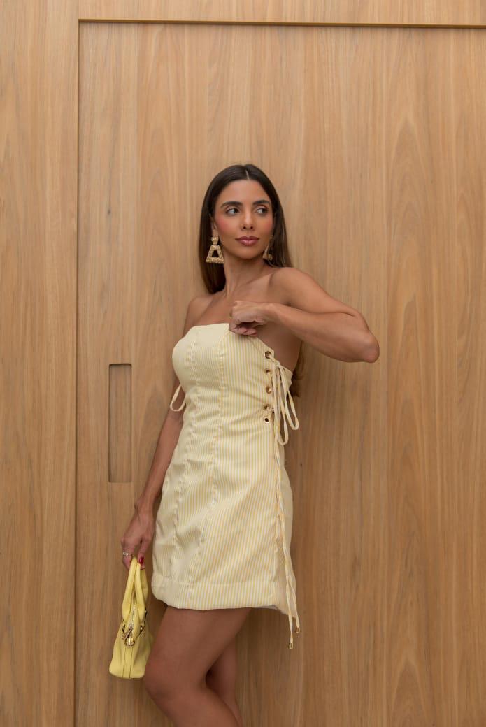 Macaquinho curto confeccionado em tecido estruturado com leve brilho e listras sutis. Embora seja um macaquinho, sua modelagem frontal contínua cria a aparência elegante de um vestido. O decote tomara que caia valoriza os ombros, enquanto as laterais contam com ilhós e amarrações que permitem ajuste personalizado e acrescentam um toque moderno ao design. O modelo possui bolsos laterais funcionais, oferecendo praticidade sem comprometer o visual. Nas costas, o lastex garante melhor adaptação ao corpo e maior conforto, complementado pelo fechamento em zíper para um encaixe perfeito. Uma peça sofisticada e versátil, ideal para composições que unem estilo e funcionalidade.
