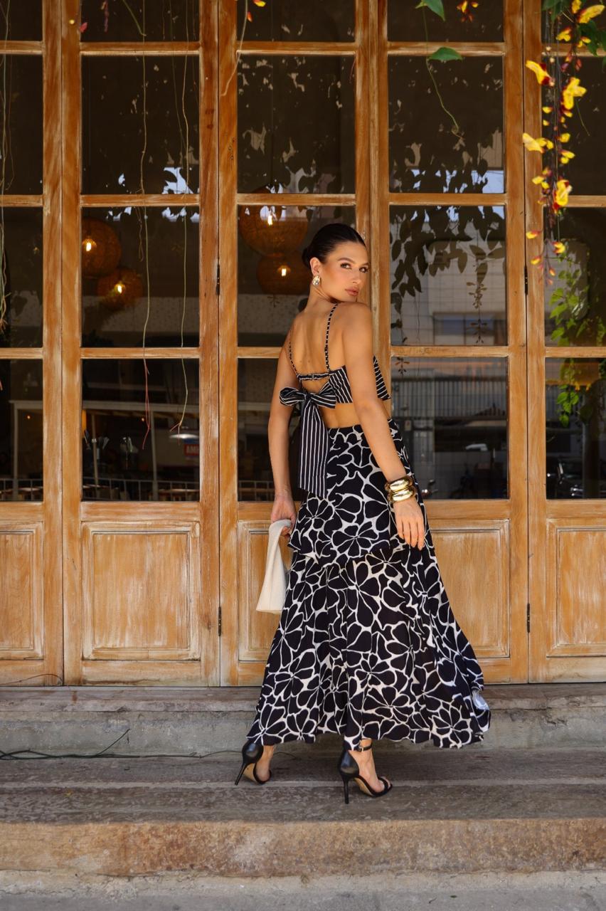 Ideal para combinar com cropped, blusas leves ou t-shirts, a Saia Flower Black em Algodão é uma aposta certa para um look verão chic, unindo conforto, frescor e elegância em uma só peça.