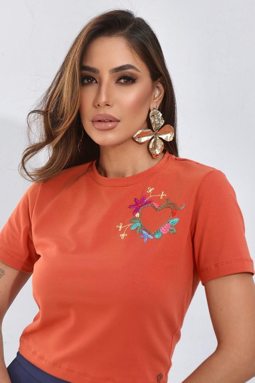 T-Shirt feminina básica e moderna, confeccionada em malha de alta qualidade composta por algodão com elastano. Essa composição proporciona um toque macio, confortável e um ajuste levemente estruturado ao corpo. A cor é um tom de terracota, telha ou laranja queimado, que é elegante e atual.