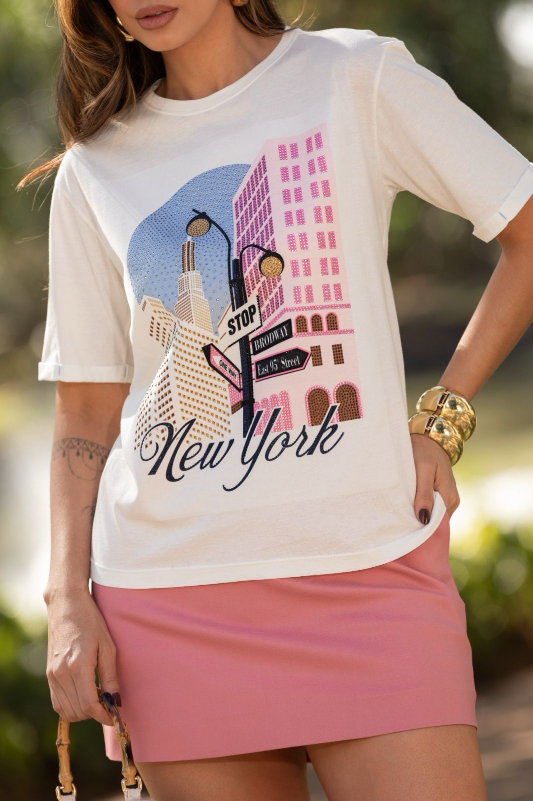 O destaque da peça fica por conta da estampa frontal com aplicação de hotfix, que traz brilho sutil e um charme sofisticado, elevando o look sem perder a simplicidade. Essa combinação de elementos cria um estilo Casual Chic perfeito para o dia a dia.