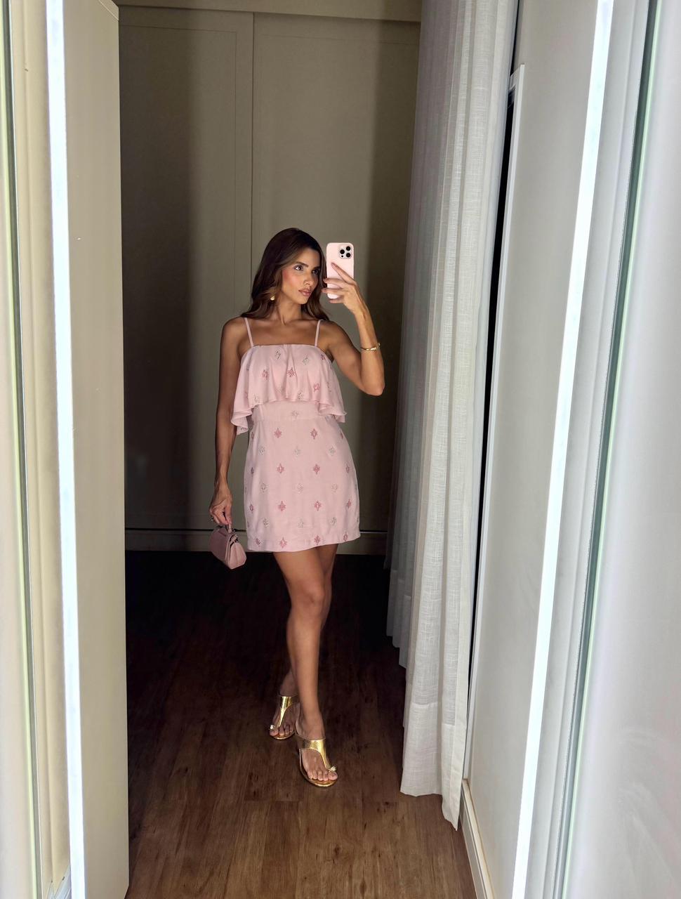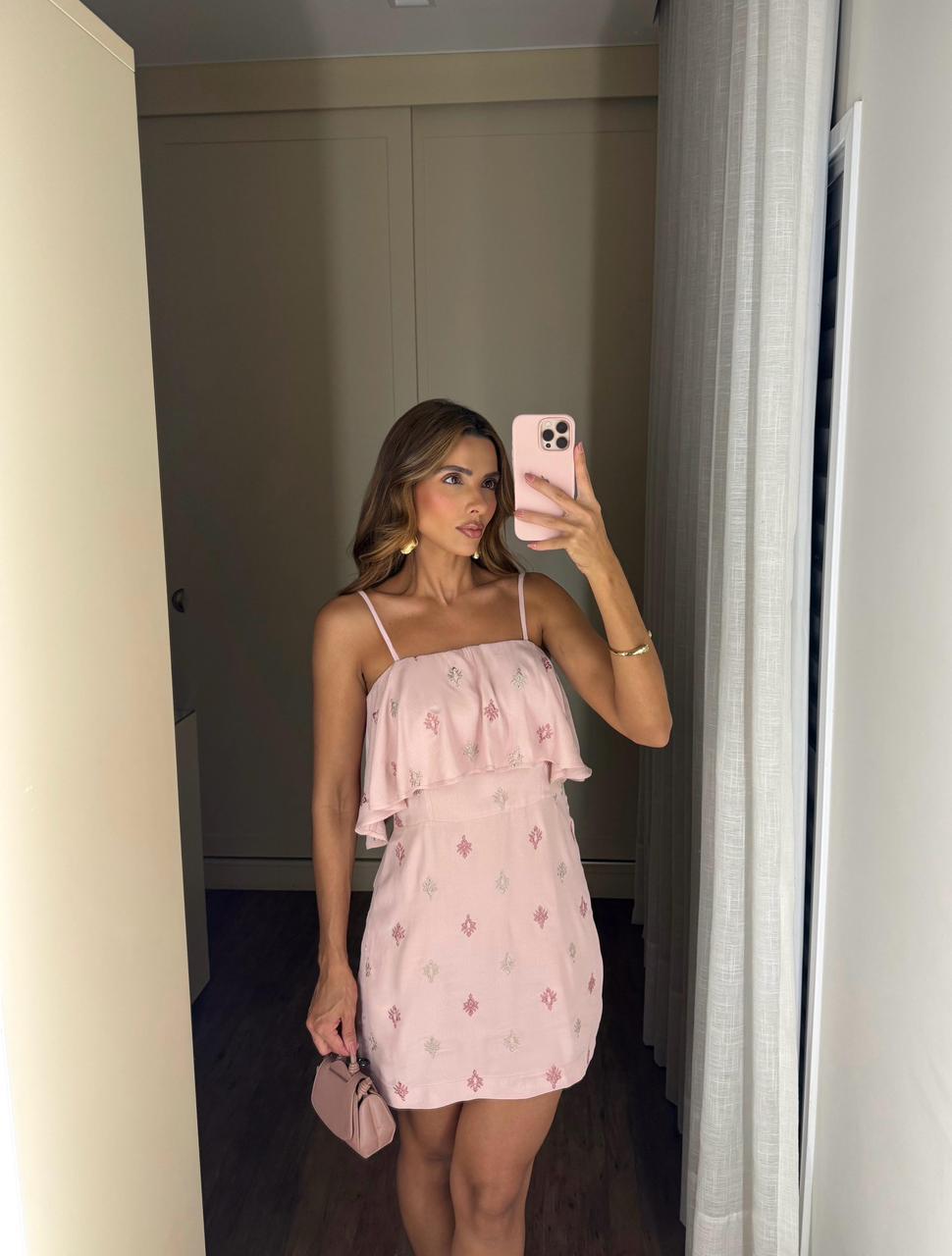 Este vestido curto é confeccionado em crepe na cor rosa pastel e apresenta uma estética marcadamente romântica. O design destaca-se pelo decote reto sustentado por alças finas, com um babado fluido sobreposto que envolve toda a região do busto e ombros, adicionando movimento à peça. Ao longo de todo o comprimento, o tecido é decorado com bordados delicados em padrões geométricos e florais espaçados, utilizando tons suaves que complementam a cor principal. A modelagem é levemente acinturada para valorizar a silhueta de forma discreta, e o fechamento é feito por um zíper invisível localizado no centro das costas, garantindo um acabamento limpo e sofisticado.