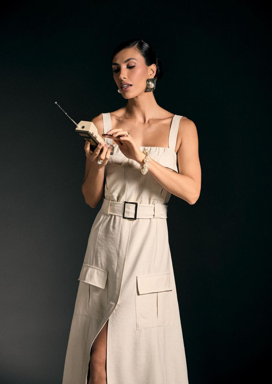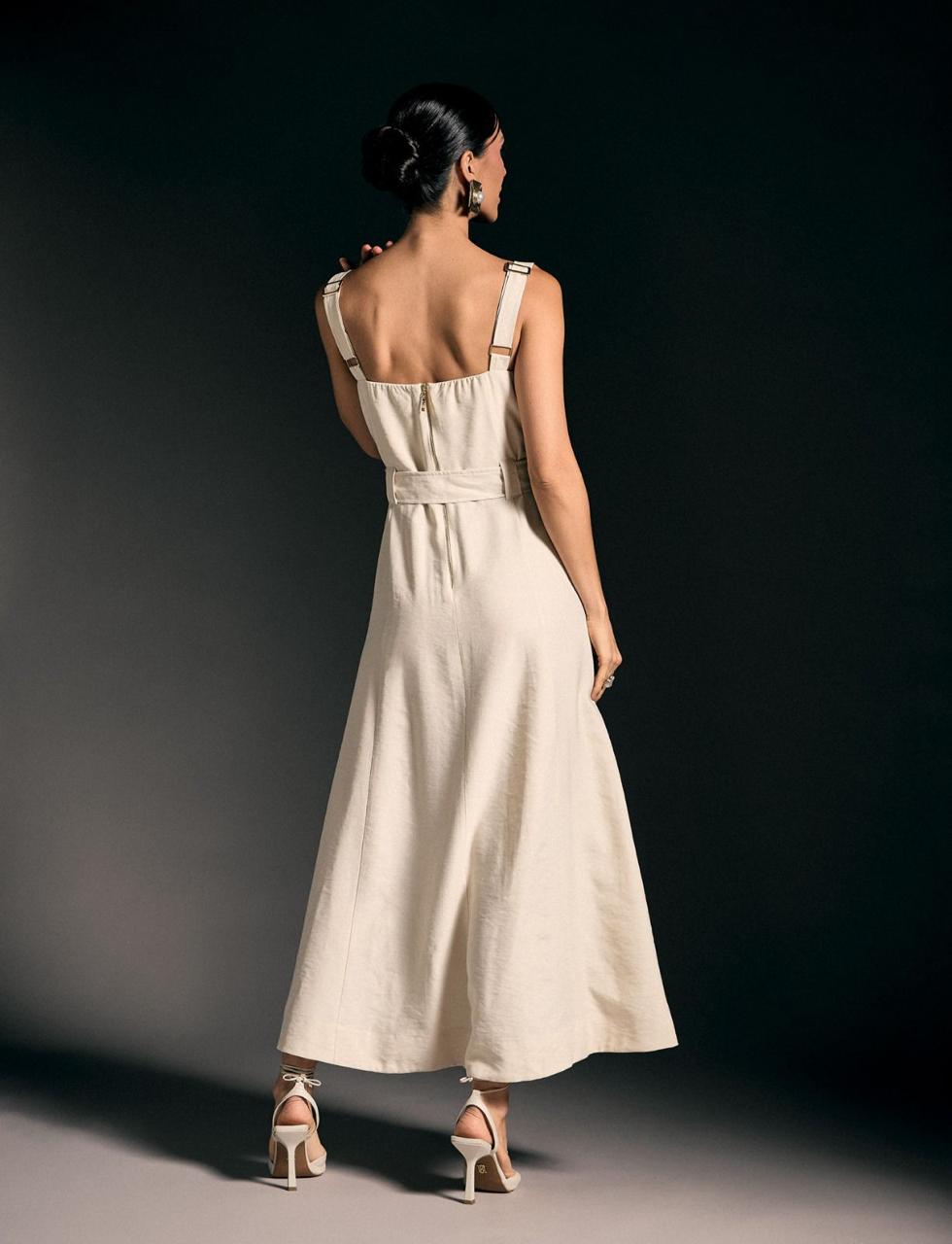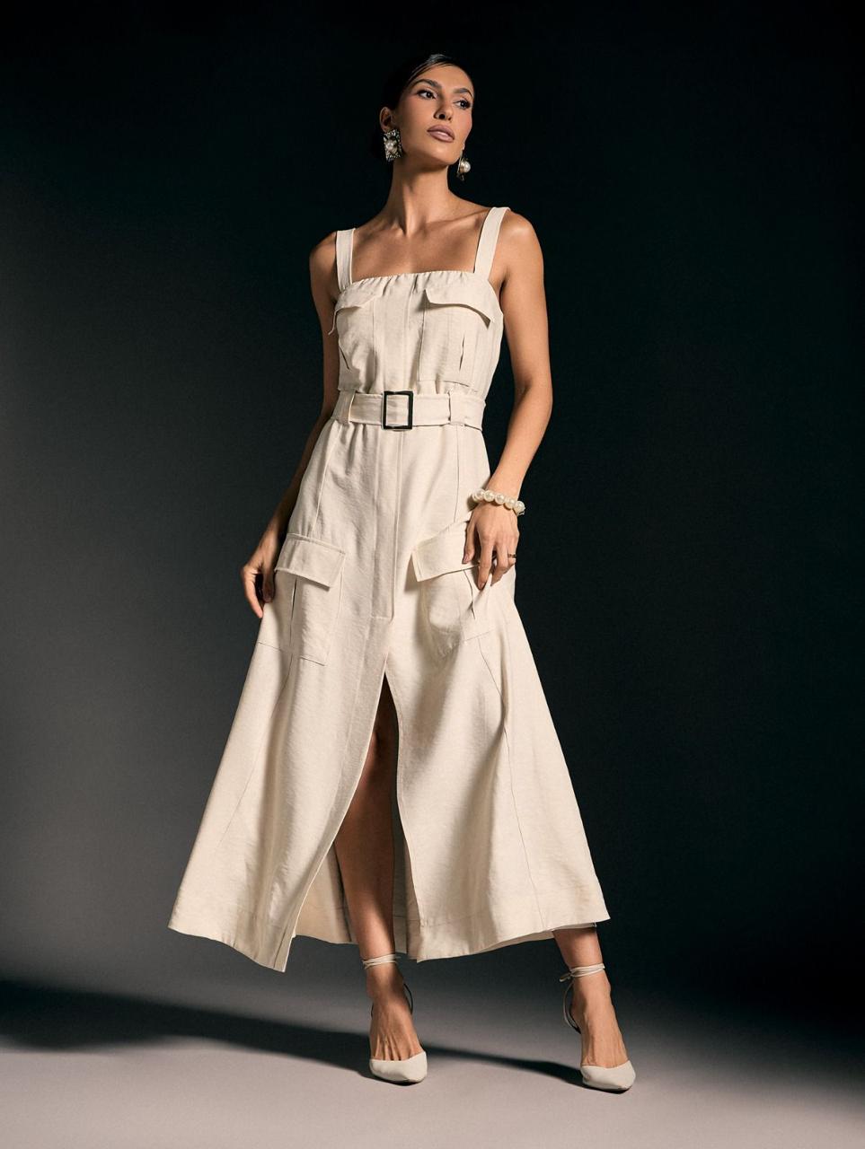 Vestido midi em tom neutro, elegante e sofisticado, perfeito para compor produções modernas e atemporais. O modelo possui alças largas e decote reto que valorizam o colo com delicadeza e equilíbrio. A parte superior apresenta recortes estruturados que proporcionam melhor ajuste ao corpo e realçam a silhueta com caimento impecável.