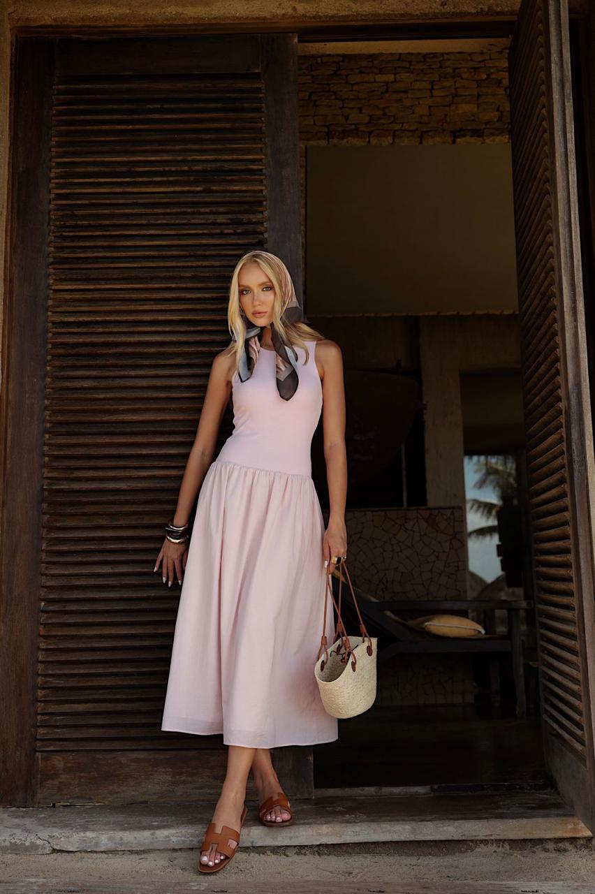 Vestido midi com parte superior confeccionada em malha canelada, oferecendo ajuste delicado ao corpo e toque suave. A peça apresenta decote redondo clássico e alças médias que valorizam a silhueta com elegância discreta. A saia em tecido leve possui caimento solto e fluido, criando movimento natural ao caminhar. O comprimento midi acrescenta sofisticação, tornando o modelo ideal para compor looks versáteis que transitam facilmente entre ocasiões casuais e produções mais refinadas. Uma peça confortável, feminina e atemporal.