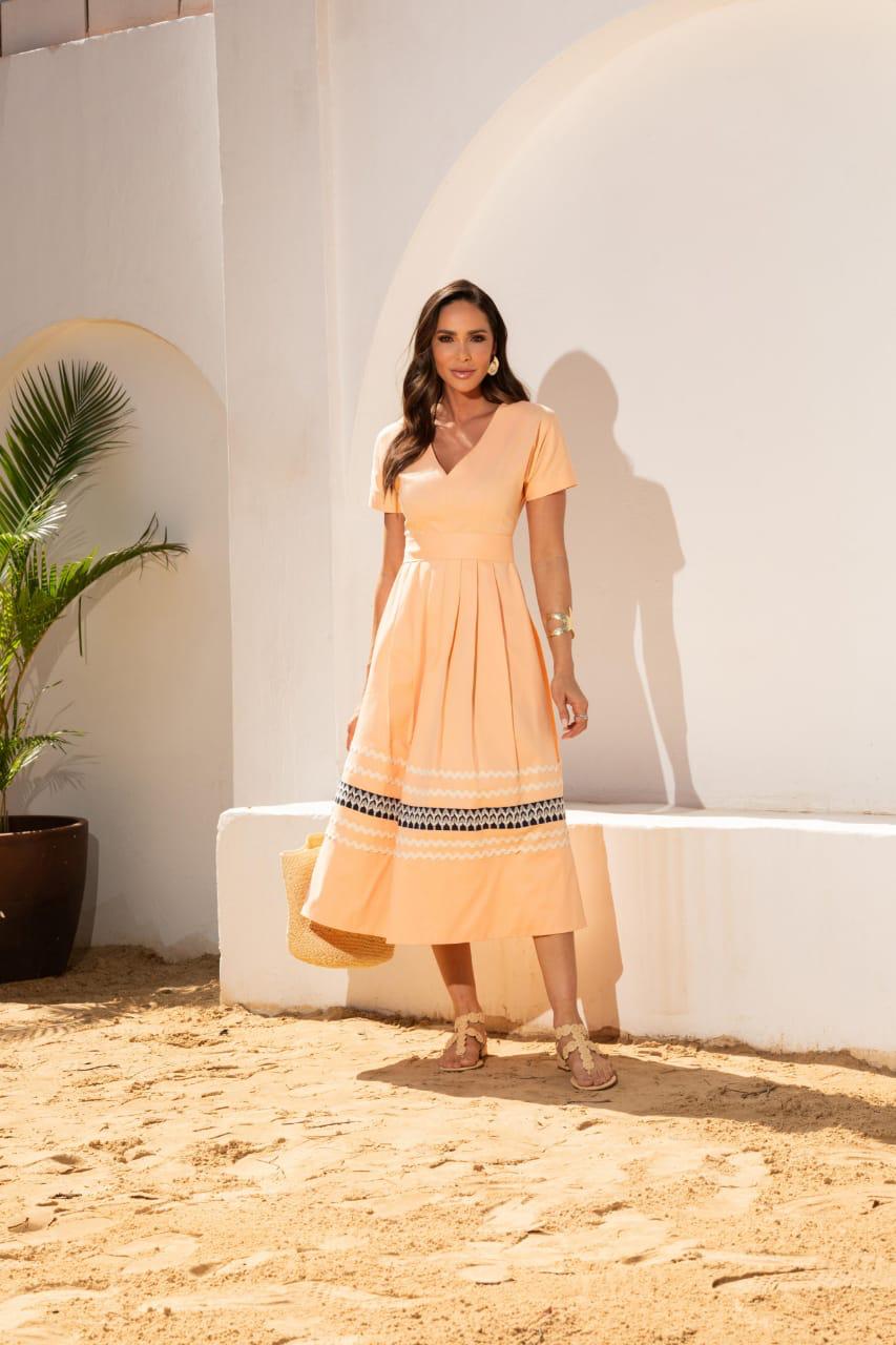 A saia midi conta com pregas bem estruturadas que garantem movimento e volume na medida certa. Próximo à barra, o vestido possui faixas decorativas em padrões geométricos nos tons preto e branco, criando contraste e dando personalidade à peça, sem perder sua delicadeza e versatilidade.